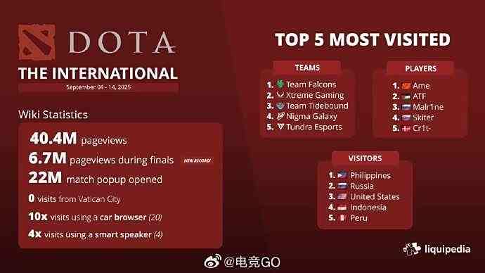 近日,Liquidpedia(液体百科)公布了DOTA2 TI2025国际邀请赛期间的相关页面的访问量,其中Ame位列头名,前五的其余四人均为Falcons成员,而关于战队方面的访问量,XG也位居第二。本次TI让全球DOTA2玩家的目光再次聚焦到中国战队和选手身上,尤其是Ame(王淳煜)几乎以断层优势登顶,紧随其后的四席均被冠军战队Falcons成员占据。