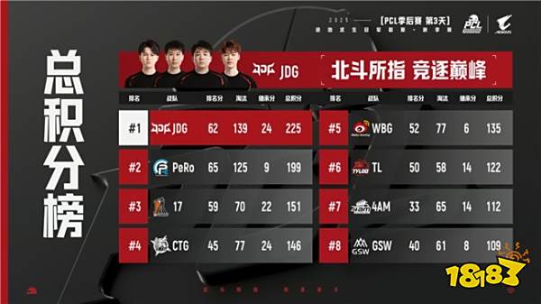 第二天比赛过后,PeRo战队继续领先,JDG和17战队紧随其后。