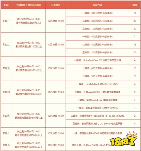 截止至10月24日11:00,在新服“如意蛇”服务器预充值即可参与预充值大派送活动。在新服进行预充值满30元及以上即可获得一个抽奖资格码。活动共有七个阶段,每个阶段都有不同的奖励,累积预充值额度越高可参与抽奖的次数也就越多,奖池内的奖励也就越丰厚。充值超过最大累计充值额度6000元,则可直接获得7个抽奖码。