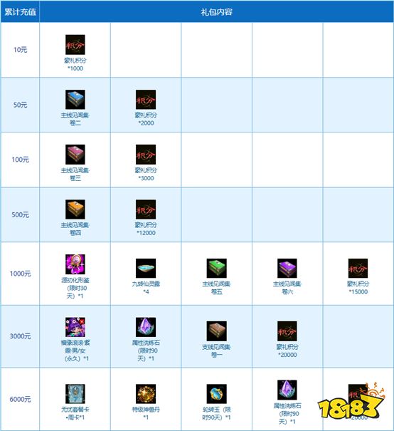 活动期间(10月13日00:00至11月09日23:59)在新服“如意蛇”累计充值达到以上金额均可获得丰厚的累计充值礼包!获得的豪礼积分可以进行抽奖或兑换福袋。福袋有机会开出随机元灵、神兽、神兽精魄、变异精魄、80级随机所有相首饰等大奖。其中玩家充值每达到50元、100元、500元、1000元、3000元、6000元阶段时,还可以额外获得一个刮豪礼资格。刮豪礼有几率获得随机元灵、限定八阶坐骑光焰北斗、随机九阶坐骑、随机神兽等超级大奖。