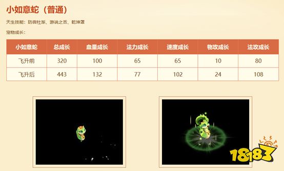 进阶成为变异宠物“如意蛇”的方法:小如意蛇不仅可以通过超级归元露强化,还可通过新服累计充值送豪礼、寻仙问道(灵气值达到500点、3000点、4000点、7000点)与300点活跃度宝箱活动中产出的如意蛇福袋进行强化。当小如意蛇已经法攻强化3次后,可前往“灵兽异人”处提交3颗变异精魄进阶为变异宠物“如意蛇。