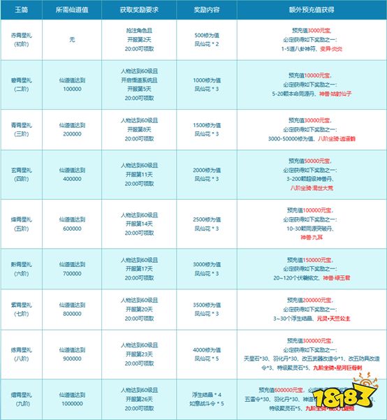 10月13日00:00至11月23日23:59期间,道友们在新服注册角色和进行预充值都可以增加新服的仙道值。累计仙道值可以激活不同档次的九霄星礼,,预充值达到对应金额还将有机会把天竺公主,九阶坐骑星河巨骨刺、银汉九曜鲲,八阶坐骑混世大荒等神兽坐骑带回家!