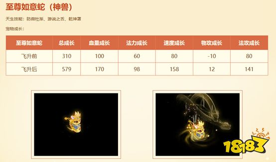 进阶成为神兽宠物“至尊如意蛇”的方法:参与“超级藏宝图”和“特级藏宝图”挖宝活动、以及寻仙问道抽奖码,有概率获得稀有道具—至尊如意蛇精魄,在“灵兽异人”处给如意蛇服用至尊如意蛇精魄可进阶为神兽宠物“至尊如意蛇”。