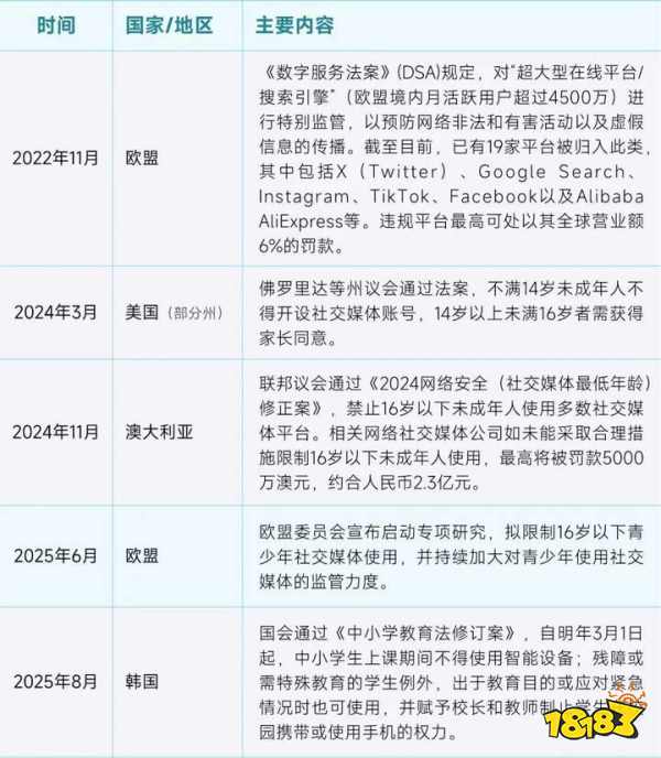 聚焦全球性未成年人保护领域可以发现,网络保护已成为全球未成年人政策的共同焦点。对比而言,中国游戏相关未成年人保护政策更加完善,而国际社会在未成年人隐私保护、网络内容监管等方面则积累了更丰富的立法与实践经验。目前,全球多个国家正在加强对未成年人使用社交媒体的限制,而了解更多地区未成年人网络保护现状,有助于我们在巩固现有游戏防沉迷体系成果的基础上,前瞻性地将治理视野拓展至更广阔的社交媒体与数字娱乐生态,构建更全面的未成年人网络保护体系。
