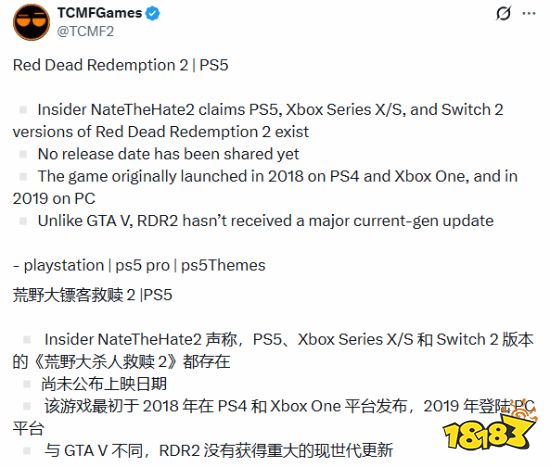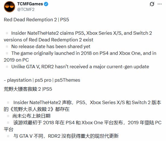 近日,知名博主 @TCMF2 汇总了关于 RDR2 增强版的关键证据。早在今年十月,资深爆料人 @NateTheHate2 就曾明确表示增强版项目正在积极推进中。