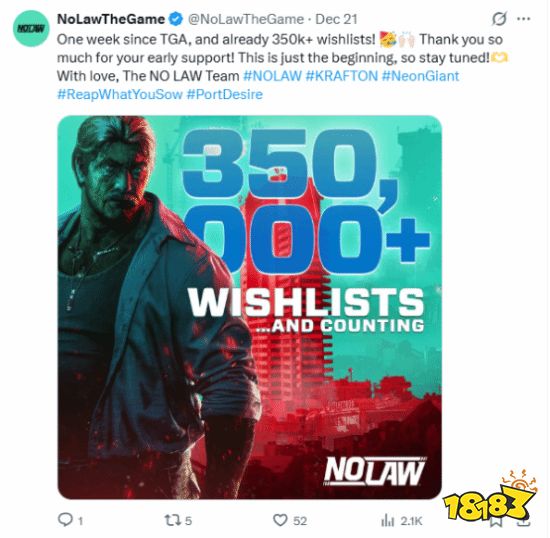在 2025 年 TGA 颁奖典礼上备受瞩目的 3A 级开放世界生存巨制《NO LAW》再创佳绩。官方数据显示,首曝仅一周,其 Steam 愿望单预约量已强势突破 30 万大关。这款由《PUBG》发行商 KRAFTON 携手瑞典知名工作室 Neon Giant 强强联手打造的新作,凭借豪华的制作阵容与惊艳的首秀表现,迅速成为全球玩家与媒体关注的焦点。