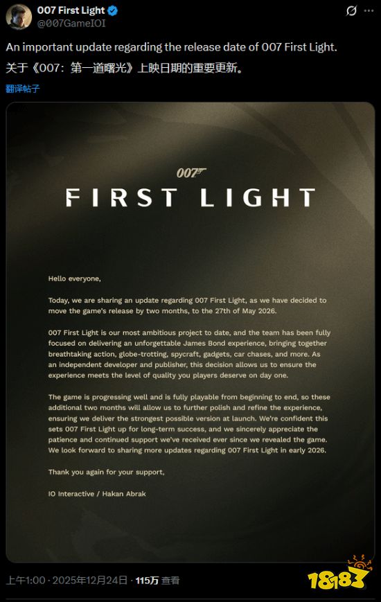 最后,IOI 补充表示,虽然发售日小幅延后,但宣发节奏并未停滞。官方计划在 2026 年初分享更多关于《007 初露锋芒》的实机演示与深度情报,请各位特工玩家保持关注,拭目以待。