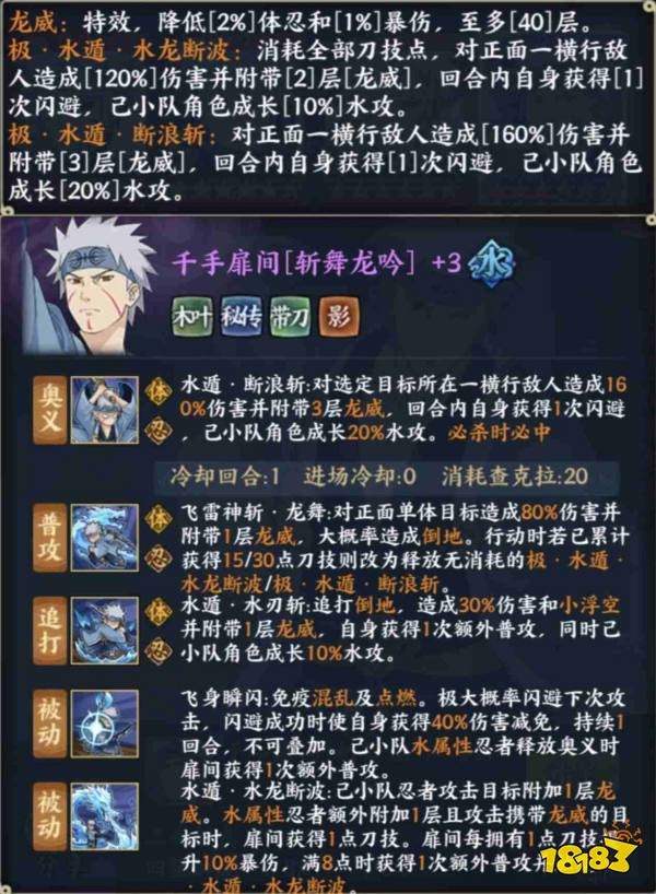 奥义:水遁·断浪斩:对选定目标所在一横行敌人造成160%伤害并附带3层龙威,回合内自身获得1次闪避,己小队角色成长20%水攻。必杀时必中