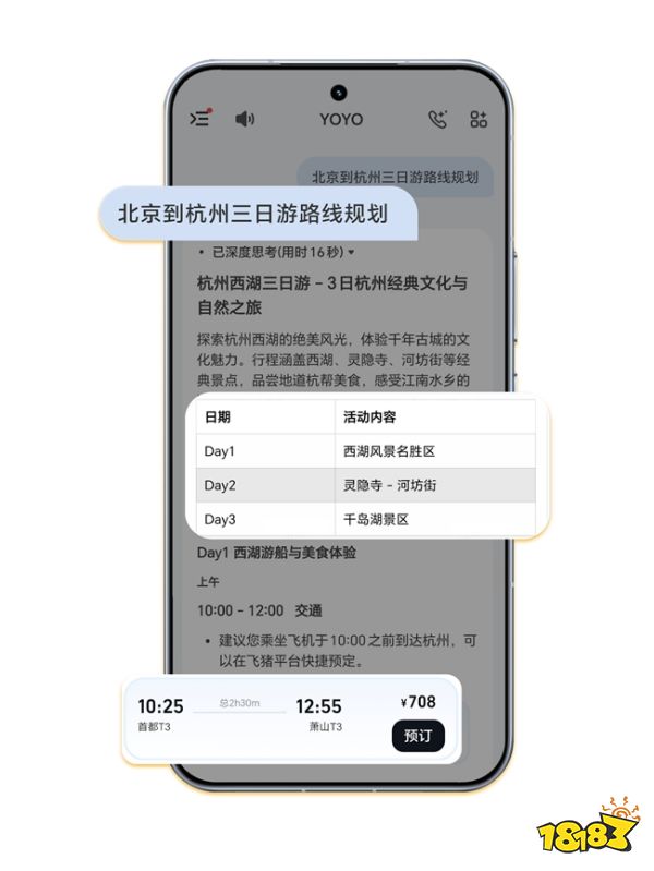 相较于传统App打开-搜索-筛选-查看的流程,如今用户则无需反复研究制定出游攻略、多平台比价,只需对YOYO说一句:“北京到杭州三日游路线规划”,它便能深度理解“短程”“小众”等用户意图,结合实时航班动态、酒店余房、景区人流数据等,分析整理出结构清晰的综合方案。如果临时想调整计划,只需告诉它:“第二天不想去西湖,有没有室内替代方案?”行程随之动态更新,灵活如私人定制。
