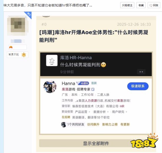 近日,网络上流传一组疑似《鸣潮》开发商库洛游戏相关招聘人员“Hanna”的朋友圈截图,并在贴吧等社区引发大量讨论,相关话题一度登上热搜。由于涉及职场身份与公开表达,该事件迅速成为玩家圈关注焦点。
