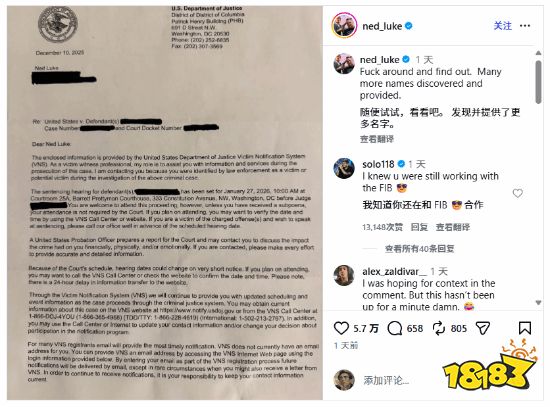 近日,卢克在社交平台发布了一份文件照片,内容看起来来自美国司法部受害者通知系统的案件相关信函,并配合发出态度强硬的留言。他在Instagram帖文中晒出的信件标注日期为2025年12月10日,信中提到:在一桩联邦刑事案件的调查过程中,执法部门已确认卢克为该案的受害者或潜在受害者。