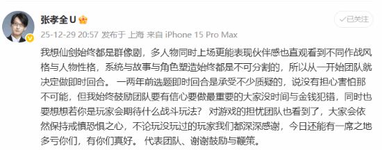 面对玩家围绕“即时回合制”展开的探讨,制作人张孝全通过社交媒体发布长文,集中说明团队的设计初衷与取舍逻辑,试图回应外界对玩法体验与系列气质的疑问。