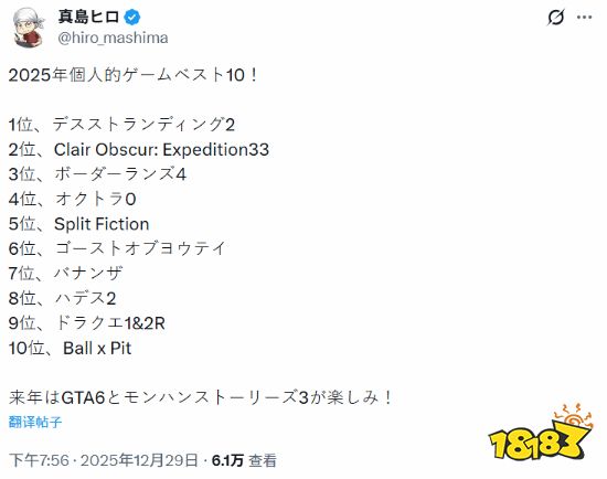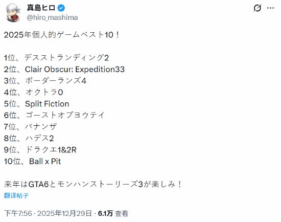 除了榜单排名,真岛浩还透露自己非常期待明年的两款重磅作品:《GTA6》以及《怪物猎人物语3》。这一补充也让讨论焦点从“年度最爱”延伸到了“下一年最期待”,相关话题在玩家社区进一步扩散。