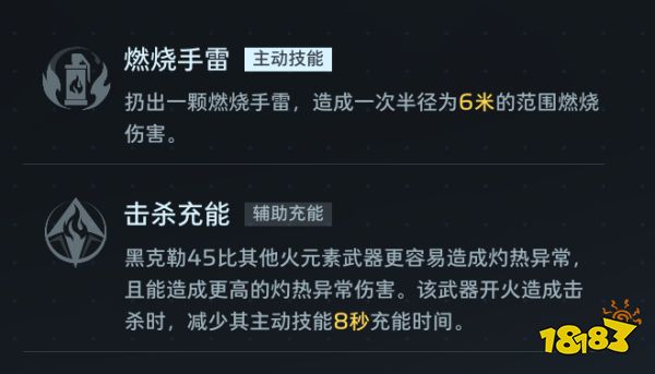 玩起来够硬:【黑克勒45 - 星蓝破晓】定位冲锋枪,其短小精悍的枪身带来了举镜速度和换弹速度上的优势,让它拥有极其卓越的机动性能。 其主动技能“燃烧手雷”可在一定范围内秒清群怪,并能通过被动技能的充能效果反复释放,是猎场刷钱的一把好手。拿到此枪能助大哥们快速上手“开荒”,积累赛季前期的起步优势。