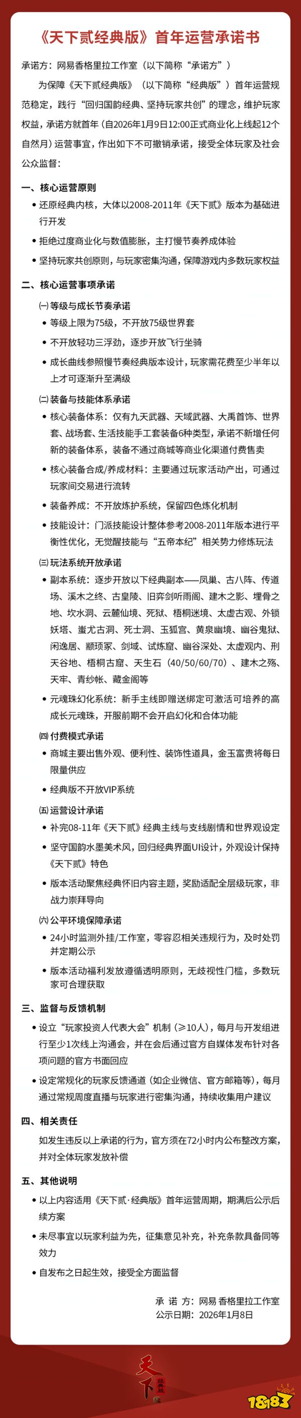 我们深知,大荒的美好离不开每一位少侠的期许与监督。在此,我们郑重公示《天下贰经典版首年运营承诺书》,并同步展示首年运营规划,从经典内核还原、慢节奏养成,到玩家共创监督、公平环境保障,每一条承诺皆不可撤销,向全体少侠庄严许下——回归纯粹国韵江湖、守护玩家核心权益的承诺!
