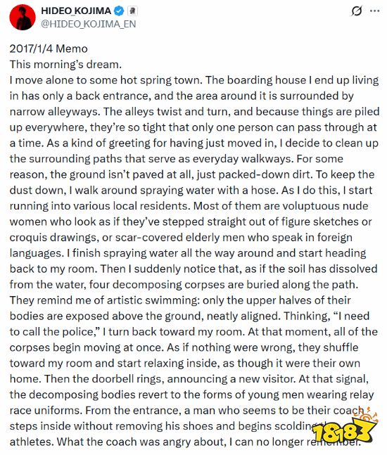 著名游戏制作人小岛秀夫近日通过社交媒体,向公众分享了一段来自2017年的梦境记录,展示了他光怪陆离的内心世界。小岛秀夫坦言自己经常做噩梦,并曾尝试通过记录梦境来应对,但最终因噩梦持续不断而放弃了这一做法。