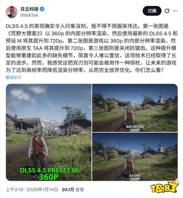 英伟达最新推出的DLSS 4.5技术再次展现了AI超分辨率领域的强大潜力。近日,有国外玩家在社交平台X上分享了使用R星游戏荒野大镖客2进行的对比测试,DLSS 4.5卓越的画面重建能力令人印象深刻,收获了大量正面评价。