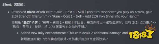 3. 静默猎手卡牌“墨之刃”效果重做:本回合每打出一张攻击牌获得力量改为将2(3)张“浸墨-小刀”加入手牌。新增附魔“浸墨”:额外造成2点伤害并施加1层虚弱。