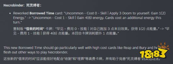 2. 骨头人平衡调整:“预借时间”效果改为获得6点能量,去除“自身获得3点灾厄”,新增“本回合所有卡牌消耗能量+1”。