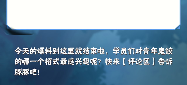 水上战斗时,若释放二技能的斩击前摇被攻击,青年鬼鲛本体会变为水分身潜入水中,本体则从水中钻出至敌人身后前冲斩击,最后留下刀光持续攻击并爆炸。豚豚小提示:此时二技能命中敌人,同样会为其附加流血效果哦~