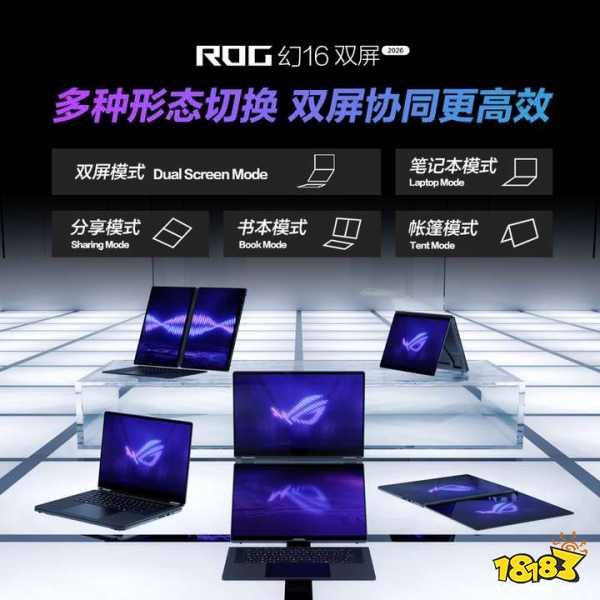 作为全球首款16"双大屏旗舰全能本,ROG幻16双屏将双屏协同的灵活体验,与旗舰级的性能配置融为一体,为专业创作者带来全新的移动生产力平台。ROG幻16双屏支持笔记本模式、分享模式、书本模式、帐篷模式及双屏模式五大形态灵活切换,双大屏协同,可提供等效超21英寸的广阔视野,打破传统笔记本的使用限制。屏幕接合处采用双扭簧两段式凸轮铰链,支持最大320°开合且机身开合流畅省力,多角度下均能提供稳定可靠的支撑,搭配D壳0~90°开合范围的镁铝合金支架,灵活适配专业设计、电竞游戏、全能AI、编程开发、视听娱乐等多场景,为创作者开启前所未有的广阔视野与全能体验。