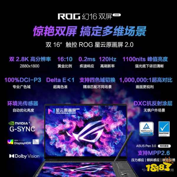 ROG幻16双屏配备两块规格相同的16英寸星云原画屏2.0,支持4096级触控,采用OLED面板,具备2.8K高分辨率、120Hz刷新率、峰值亮度高达1100nits,并通过VESA DisplayHDR True Black 1000认证,明暗细节尽收眼底。色彩素质同样出色,覆盖100% DCI-P3专业广色域,出厂预校色并支持色域切换,平均△E<1,精准还原每一处灵感色彩。屏幕表面覆盖康宁大猩猩玻璃与DXC抗刮防反射涂层,构建卓越的视觉体验。