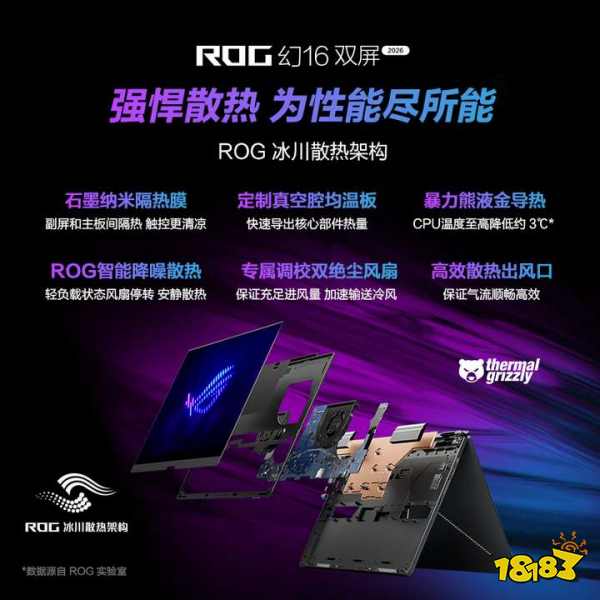ROG 幻16 Air 2026 在保持约 1.85kg 重、1.49cm 薄的出色便携性同时,目前可选配 RTX 5060/5070 笔记本电脑 GPU,同样配备英特尔酷睿Ultra 9 386H处理器,并采用全新升级的冰川散热架构,使整机核心功耗释放提升至 155W,性能更为强悍。其 16 英寸星云原画屏2.0拥有 2.5K 240Hz 的高刷新规格,同样具备 1100nits 峰值亮度与 VESA DisplayHDR True Black 1000 认证,为专业工作流提供更沉浸、更流畅的视觉体验。