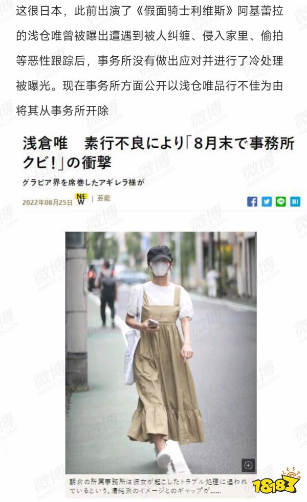 浅仓唯已与该事务所解约,根据日媒后续报道,“品行不佳”一事不实