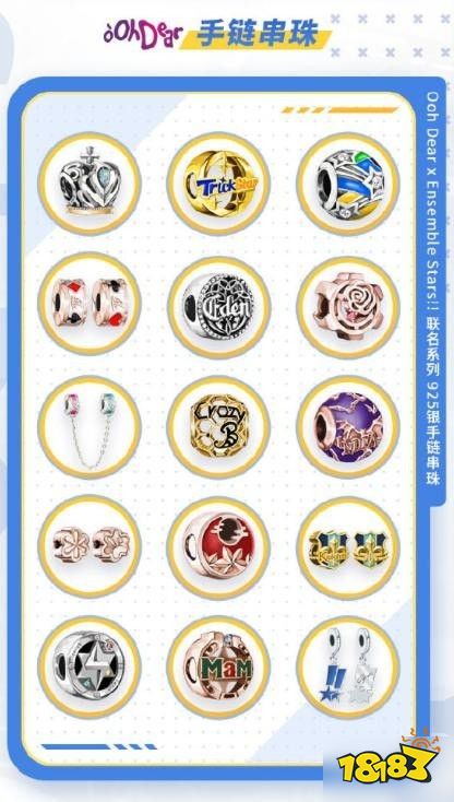 此外,《偶像梦幻祭2》与 IDo 携手推出Ooh Dear手链串珠15枚(14款队伍款+1款定制款,支持刻字),以不同的材质和宝石诠释不同风格的偶像们。每个组合不同的风格特色,与璀璨优雅的华美珠宝相结合,彰显了组合独特的魅力。