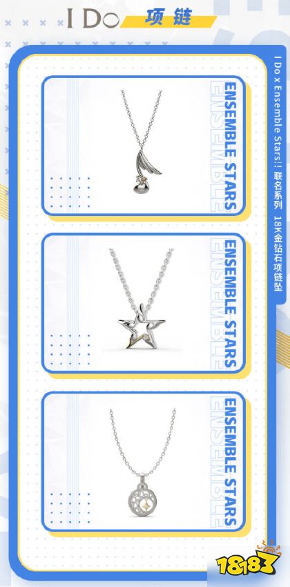 《偶像梦幻祭2》与 IDo官方联动,以小偶像们的特点为灵感,推出了精美的联名珠宝!本次联动共推出3条钻石项链坠,材质为18k金+钻石。璀璨的钻石诠释了偶像的闪耀!