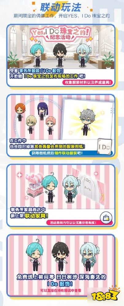 在正式公测后,《偶像梦幻祭2》游戏内将会有期间限定偶像工作限时登陆!制作人们可以通过完成【I Do珠宝之约发布现场的工作】,收集服装材料以及养成道具;在工作中,也会同时掉落小偶像们会用到的服装图纸,制作人们活动图纸后就可以制作联动服装;在事务所家具商店中,也会有联动家具全新上架,玩家们可以以优惠价格购买。在活动期间,制作人们均可免费获得朔间零、日日树涉、深海奏汰的I Do服饰,制作人们可以直接在持有服装中查看。