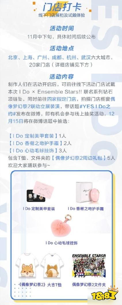 想要线下感受定制珠宝的魅力,立刻来指定门店打卡吧!六大城市20家门店实物试戴,切身感受珠宝的优雅,拍照打卡还可参与赢大奖。制作人们可前往20家指定门店试戴I Do × Ensemble Stars!! 联名系列钻石项链坠,同时前往四家指定门店,拍摄门店橱窗偶像梦幻祭2联动立展装潢,带话题#YES I Do之约#发布微博,即有机会获得I Do定制美甲套装、I Do心动毛球挂饰、I Do香榭之吻护手霜,以及偶像梦幻祭2 周边礼包。