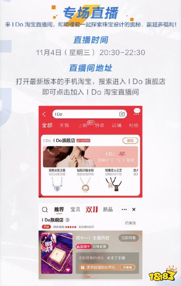 11月4日20:30-22:30,偶像梦幻祭2助理君将来的I Do淘宝直播间,为制作人们送上满满的福利!立刻来到I Do淘宝直播间,和助理君一起探索珠宝设计的奥秘吧!参与互动,即有机会获得I Do定制版斐色耐悠悠镜、I Do精美婚纱摆件、I Do定制美甲套装、I Do心动毛球挂饰、I Do香榭之吻护手霜等精美奖品。