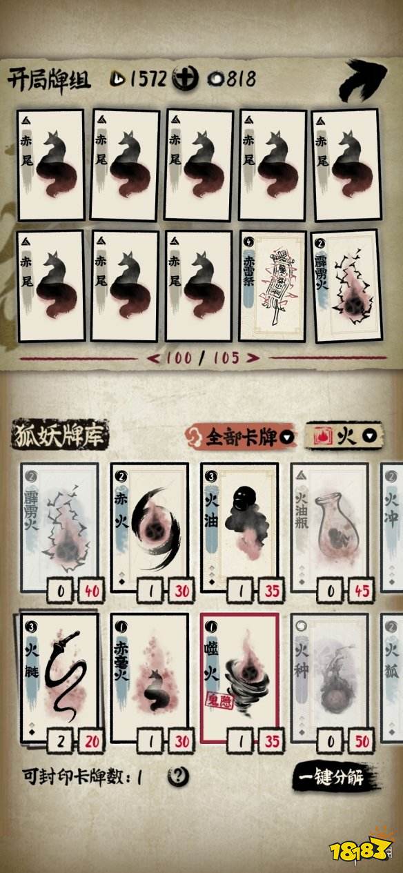 可以看到,除了一张赤雷祭,一张霹雳火,其余全带初始牌0赤尾,总计100负重,买完角色就能用。如果做完所有小传,这时会有120点负重,就可以再带一张20负重火链,此时真正实现初始牌组第一回合无限。下面解释套路。