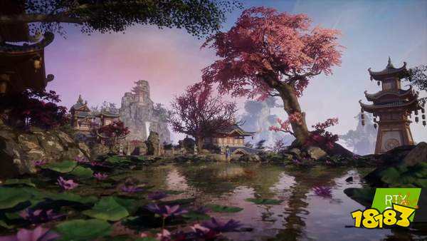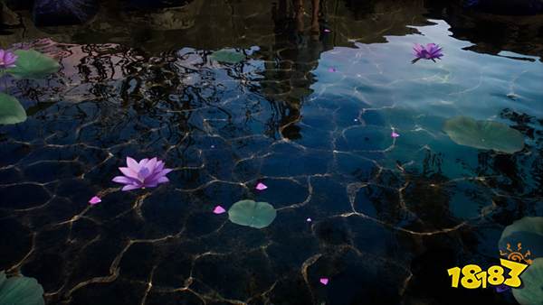 清澈见底的池塘不仅能够反射岸边树木建筑的婆娑倒影,池水还展现出波光粼粼的水体焦散效果,使得玩家理想中的仙侠世界更加真实。池水使用了英伟达的Hybrid Translucency技术,令池水的反射效果得到了光线追踪的加持,反射效果相对于传统的SSR技术更加的真实逼真。焦散效果使用NVIDIA基于光线追踪的Ray-Guided Water Caustics(RGWC)技术实时计算,能够让水体的焦散效果和人物产生逼真互动,两者结合,便产生了现在看到的符合仙剑奇侠传绚丽效果的池水,这是传统渲染方法难以做到的。