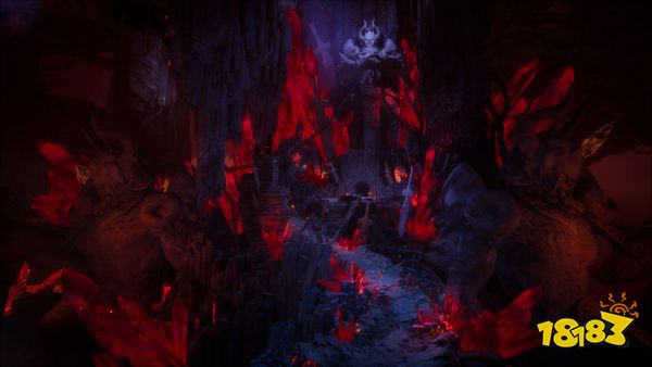 幽深洞穴中猩红色水晶散发的光芒映红了周围的洞壁和小路,仔细观看还会发现晶体的光映在地上形成更为亮眼的焦散光斑,不同于水焦散,这里使用NVIDIA的Adaptive Anisotropic Photon Scattering(AAPS)的光线追踪技术,该技术可以对半透明物体产生精确的实时焦散效果,更加凸显了洞穴的神秘氛围。