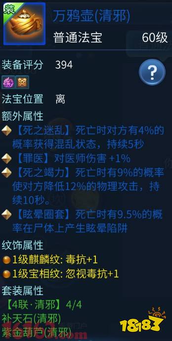 四,这个画一下重点,很多人都会忽视,那就是罪医词条,接上文中武器,武器是有可能出罪医词条的装备,如果不愿意换武器,可以在自己鬼装上洗出罪医词条,能在门派中给医生增加不少伤害。其实除了鬼装,还有一点,那就是法宝上面的词条,医生专门给门派配的毒抗法宝并不是天天带着的,没必要搞什么五百六百七百评分,洗一洗,洗出罪医词条,一般来说出罪医,最低都是1%,八件法宝加起来就是8%,这个在门派中,增加的伤害还是很可观的,如果运气好,单个法宝就出什么3%,4%的,八件法宝那直接就是24%到32%,如果武器上面也有罪医词条,直接就能增加三四成伤害,这能够当压死医生的最后一跟稻草么?你说呢?