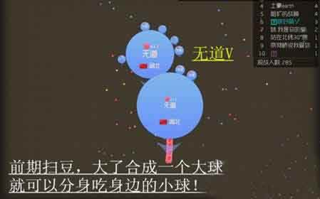 球球进去后有些人会与你合作一般对方会吐几个球(介意看下对方的大小与你差不多是真心合作,比你大几倍吐球给你那只是想吃你。一般不介意这种合作法,生存真心合作的很少)这种玩法风险很大,碰到真心合作的那就可以浪了,与个人合作打法相同,唯一不同就是多吃小球!