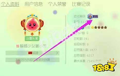 1.首先,进入游戏后,点击个人中心,在个人资料中,可以看到一共分成2栏,在游戏数据的段位等级下方,依次是总MVP数,进化等级。此时我们点击进化等级,点击【进化等级】。进入后就会出现各种球球大作战的音效啦。进化等级越高,音效的品种就会越多哦!