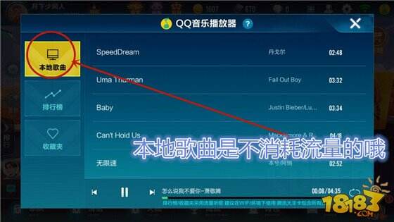 (1)本地歌曲就是我们《QQ飞车手游》本身自带的歌曲,播放本地歌曲无需消耗流量,对于出门在外无WIFI的流量党来说是个最大的福利。而且这些歌曲都是从端游时代延续而来的经典曲目,让车手们在比赛中能充分感受到飙车的快感!