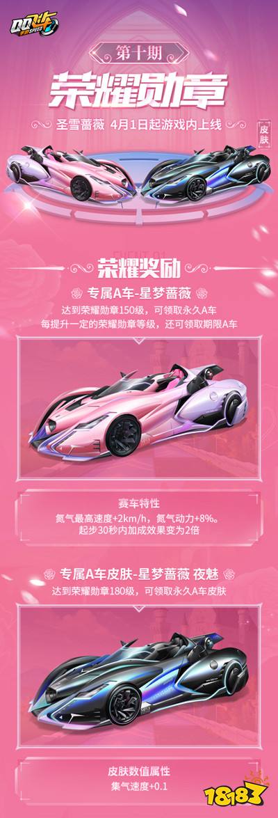 4月1日,荣耀勋章第十期-圣雪蔷薇正式上线,全新A车星梦蔷薇携赛车皮肤星梦蔷薇夜魅浪漫来袭,浪漫的梦幻粉和充满科技的炫酷蓝,车手们中意哪款呢?