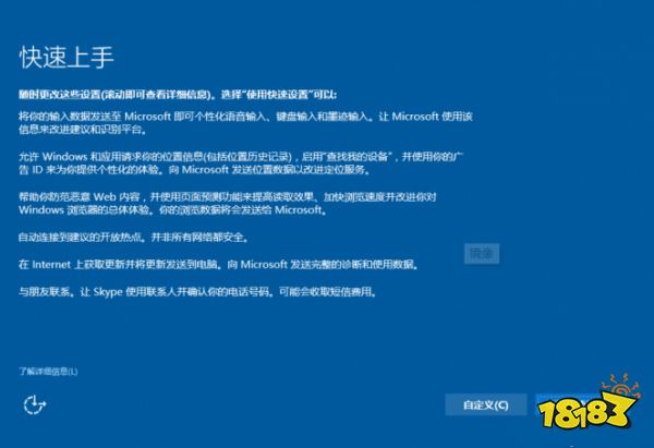 看到下面这张图的时候可千万不要觉得麻烦,直接点选“使用快速设置”,这样等于把所有的个人隐私交给了微软。