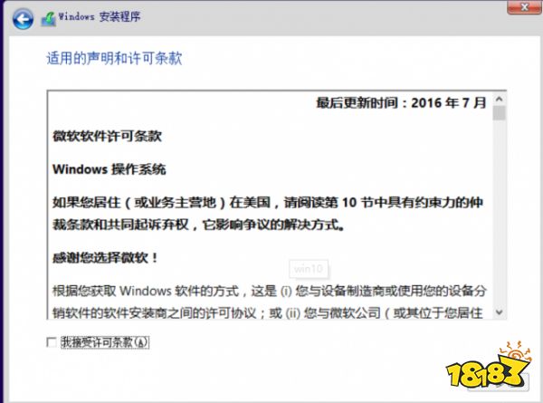 2、至于微软的服务条款,直接勾选进入下一步。选择下面的“自定义:仅安装Windows(高级)”