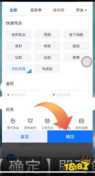 4.在弹出的浮层框中选择一个分类并点击它,再点击【确定】即可筛选账单。