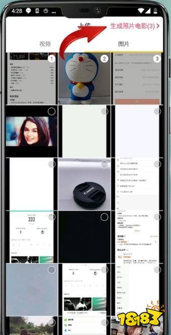 4.勾选你要上传的多张照片,再点击右上角【生成照片电影】