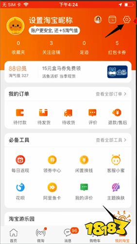 打开淘宝,点击右下角我的淘宝,选择设置图标,