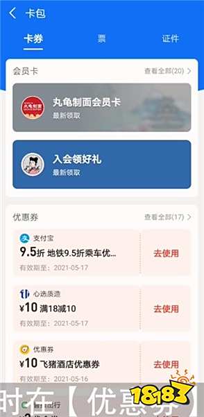 在支付宝上领取了优惠券之后,可以在【支付宝】首页面,点击右上角的【卡包】图标,