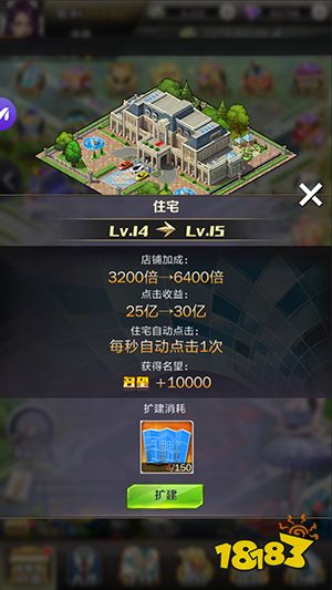 首先,店铺有10个,还有一个住宅,住宅是增加店铺的收益加成的,住宅等级越高,那么收益也就越高。而这一个住宅,是给10个店铺全部加成的,不是只给某一个或者某几个。所以首先我们能看到游戏的后期就是10个高级店铺+1个高级住宅。住宅升级比较难,升级所需的蓝图,来源非常的紧张稀少,只能慢慢攒,慢慢升级。