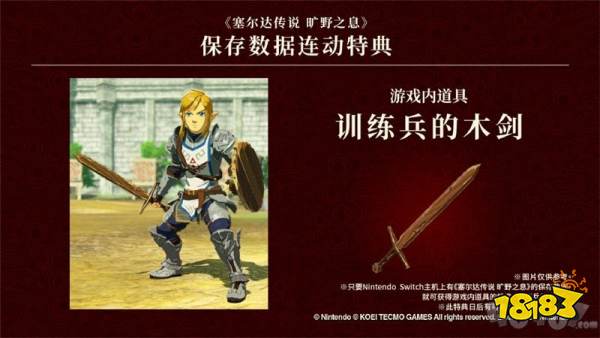 塞尔达传说:旷野之息》的连动特典决定另外,将发布与《塞尔达传说:旷野之息》的游戏记录连动特典。只要Nintendo Switch主机上有《塞尔达传说:旷野之息》的储存资料,就可获得游戏内道具的特典「训练兵的木剑」