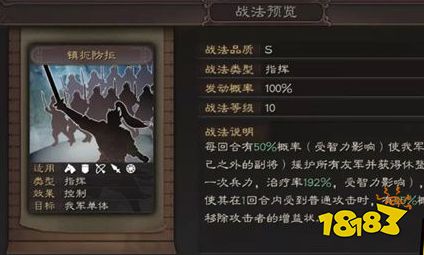 因为满宠是S8推出的武将,很多小伙伴对其还不太熟悉,我们先来看一下满宠的自带战法--镇扼防拒。指挥战法,50%概率(受智力影响)优先让除自己以外的副将(曹操说的就是你)援护所有友军,并回血。并且当其(曹操)受到普通攻击时候,还能移除攻击者的增益状态。